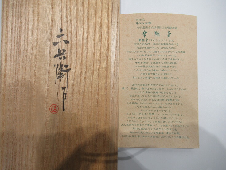 先日アップいたしました、清水焼特製酒器『金翔壺』の箱内にある作家様のご署名と落款、また説明文を写真に撮りました。ご確認ください。