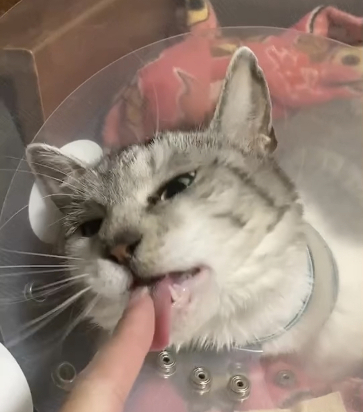 順調に回復しているハッピーですが、傷口が完全にくっついて抜糸が終わるまでは安静にしていないといけません。ママさんがいつもそばにいて撫でたりオモチャにじゃれさせたりしてハッピーの動きたい気持ちを紛らわしてくれてます。