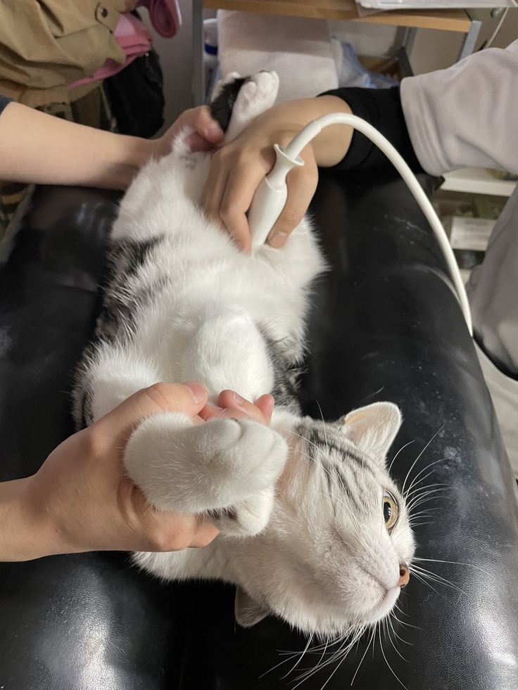 2022年12月27日、我が家にに来て約2ヶ月半。レイの呼吸が正常ではなく苦しそうに見えました。翌日28日、かかりつけの動物病院を受診しました。胸水が溜まっている為、呼吸が苦しくなっているとのことで胸水を100cc抜去、血液検査、レントゲン、エコー検査を受け、先生がおっしゃったのはおそらくFIP(猫伝染性腹膜炎)の可能性が高いこと。