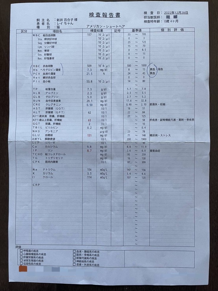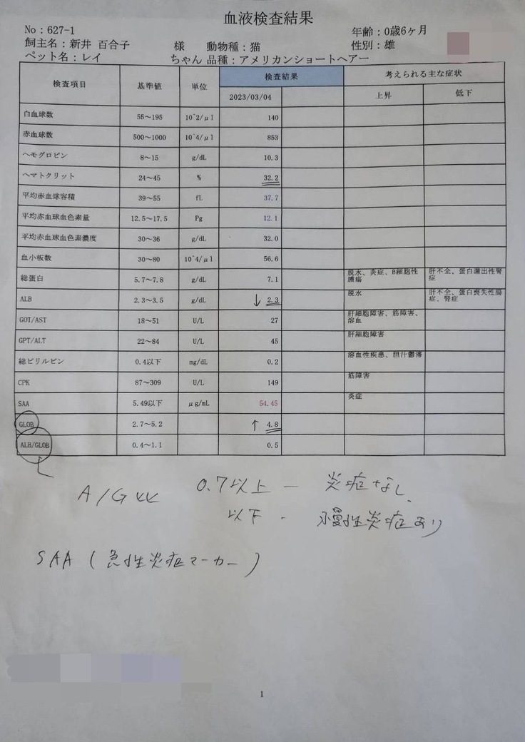 ALBの値が低く、GLOBの値が高いのはFIPの特徴的な病変であり、A/G比率は0.7以下は慢性的炎症と言われました。