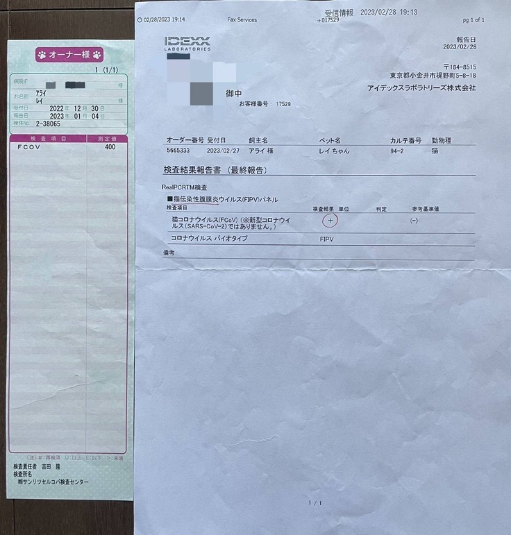 そして確定診断をするために、猫伝染性腹膜炎検査(FCOV)をしました。結果が出たのは30日、基準値が400未満であれば正常、レイの数値は400。