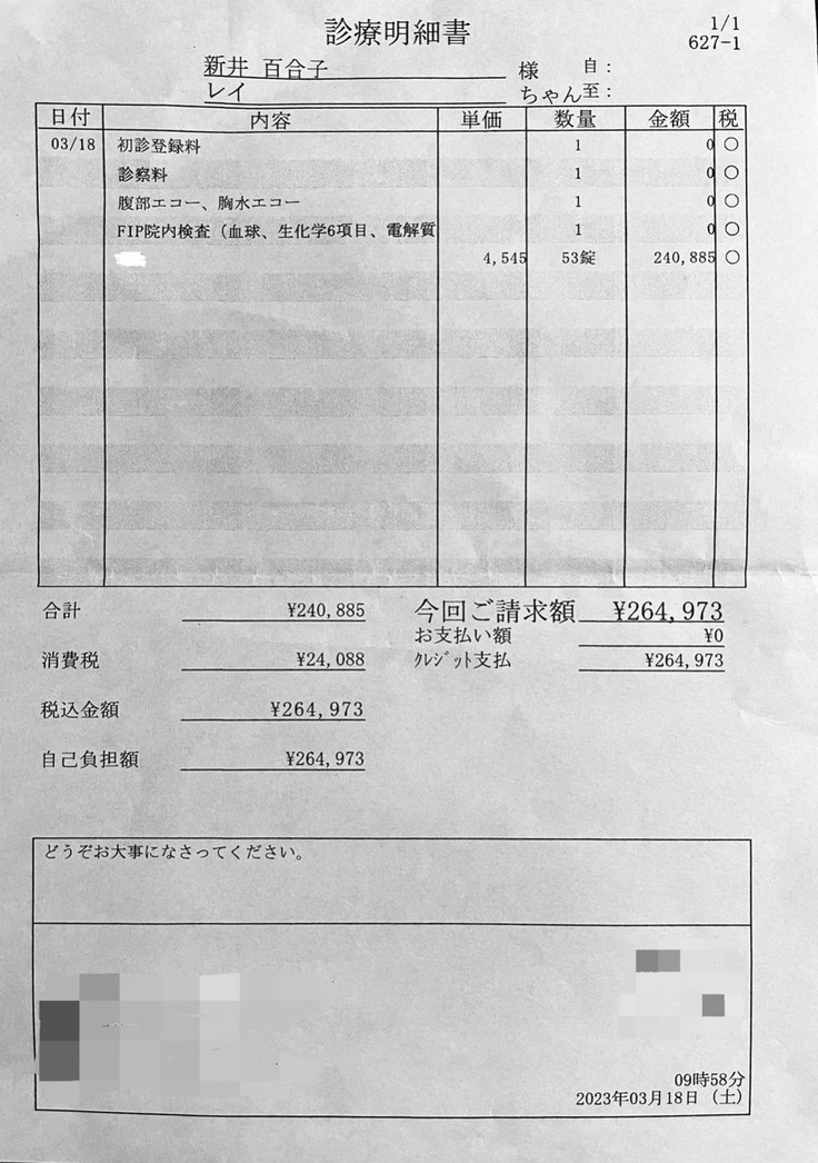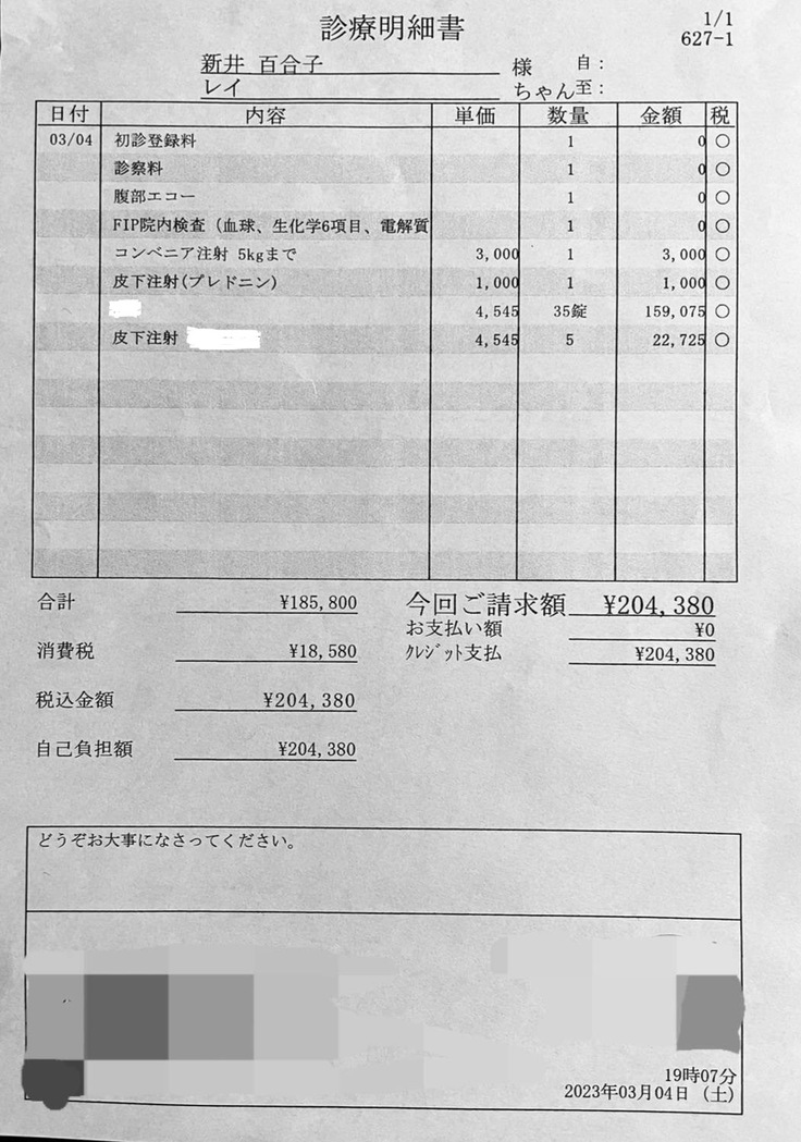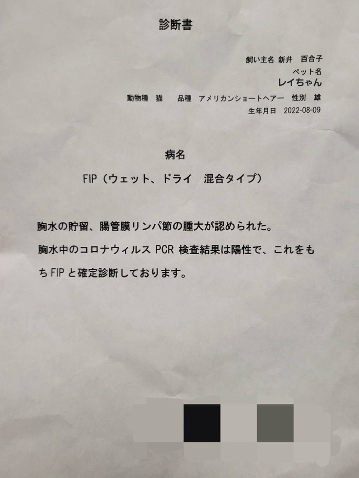FIPの致死率は100%「残された時間は2週間から1ヶ月、長くて半年です」と言われました。今、目の前に居るレイが居なくなるかもしれない。一気に失意のどん底に落とされた気持ちになりました。