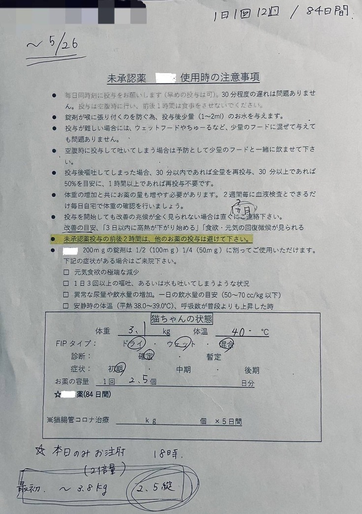 レイの命を助ける為、FIP効果のある新薬の投与を84日間持続させます。体重の増加により投薬の量が増えます。
