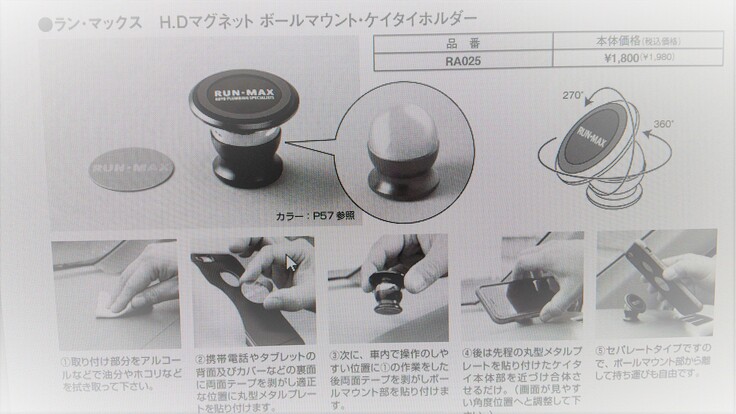 ・スマホホルダーは固定できるマグネット式のホルダー、ボールマウント部が大きく稼働しますので位置調整が容易です。