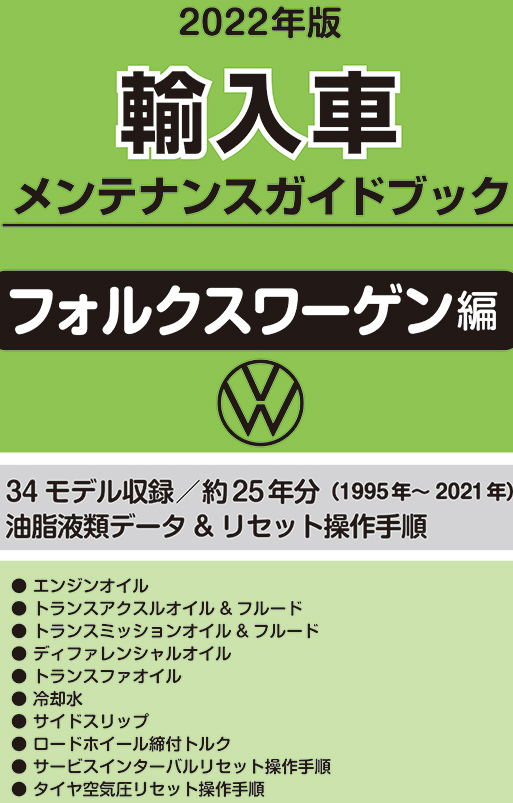2022年版 輸入車メンテナンスガイドブック アウディ編書籍について■輸入車のメンテナンスデータ25年分をまとめました!■待望の輸入車データブックを遂に発刊しました!油脂液類データ ▪エンジン型式毎にエンジンオイル容量・SAE粘度を収録 ※オイルフィルター&ドレンプラグ締付トルク値も分かります。 ▪ATF、2ペダルMTオイル、MTオイル、デフ、トランスファーオイル 冷却水の容量・指定油脂・交換要領等タイヤ&ホイールデータ ▪横滑り量の例外的取扱車両のサイドスリップ数値 ▪ロードホイール締付トルク値初期化リセット作業 ▪エンジンオイル交換後のサービスインターバルリセット手順 ▪タイヤ空気圧充填後のリセット手順 収録車両:1995年~2021年の約25年分。 2022年5月時、旧型・生産終了車両。発行日: 令和4年6月発行サイズ/ページ数: A5版/104ページ