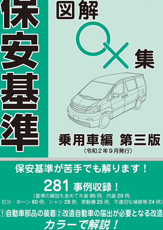 車検○×写真集 Vol.2書籍について~カラー写真で紹介する部品・用品装着時の判定事例集~その改造、保安基準に適合か?24の事例を徹底検証!皆様へ不正改造を防止するための書籍です改造を助長するための書籍ではありません●平成24年1月に車検○×写真集Vol.1を発刊して以来、早2年が経過しました。その間、新しい自動車部品・用品の登場や法令の改正等により保安基準の○×について判定が難しい事例が山積みになっていることを実感しておりました。●この度、プリウスについては国土交通省 近畿運輸局 大阪運輸支局、ジムニーについては軽自動車検査協会 東京主管事務所にご協力を頂き、継続検査+取材という形で改造又は装置の取り付け等を行った実車を判定して頂けました。発行日: 平成26年10月発行サイズ/ページ数: A4版 240ページ