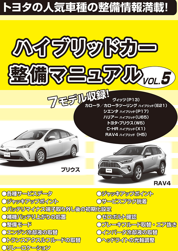 ハイブリッドカー整備マニュアル VOL.5書籍について本書は、現場でハイブリッドカーの整備に関する必要な情報にすばやくアクセスできるよう制作された、『ハイブリッドカー整備マニュアル』シリーズの5作目となります。前作の“VOL.4”に引き続き今作も、市場に多く出回るトヨタの人気ハイブリッドモデル7車種を収録しました。油脂類の交換量データからフルードの取替方法などをまとめています。★収録車種★・ヴィッツ(ハイブリッド)(NHP130系)・カローラ /カローラ ツーリング (ハイブリッド)(E21系)・シエンタ(ハイブリッド)(NHP170G系)・ハリアー(ハイブリッド)(AVU65系)・プリウス(ZVW5系)・C-HR(ハイブリッド)(ZYX10系)・RAV4/RAV4 (ハイブリッド)(AXAH5系)※電気に関する基礎知識等は、収録していません。こちらは平成22年1月発刊の『ハイブリッドカー整備マニュアル 』の1作目を御覧ください。発行日: 令和2年12月発行ISBN: ―サイズ/ページ数: A4版/170ページ