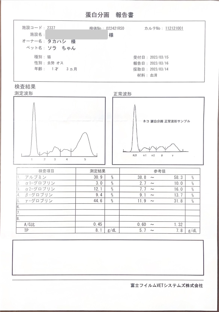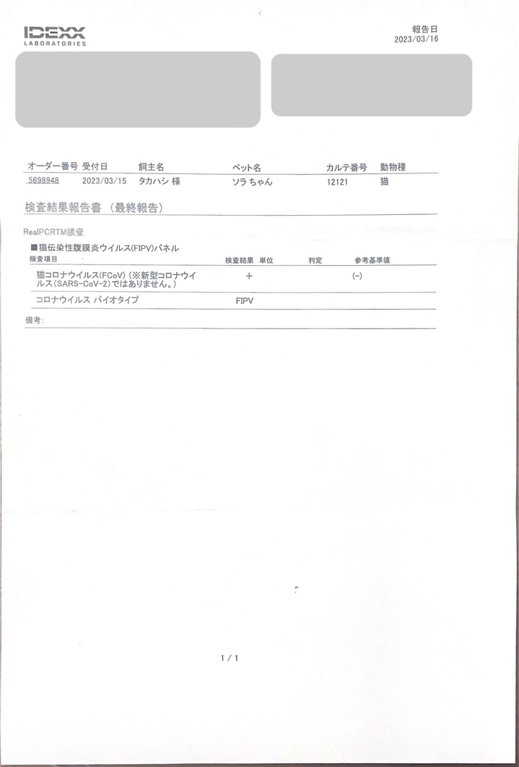 2023.3.16 病院から電話があり、FIP(ウエットタイプ)陽性の確定診断を受けました。ここのかかりつけの病院ではFIP治療が出来ない為、病院を紹介していただきました。