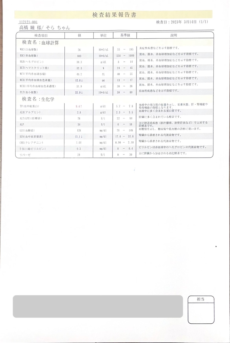 2023.3.14 食事量が減って、元気がない様子が見られました。季節の変わり目や食事の好き嫌いなどを疑いましたが、一向に様子が変わらない為、念のため病院にいき検査を行いました。