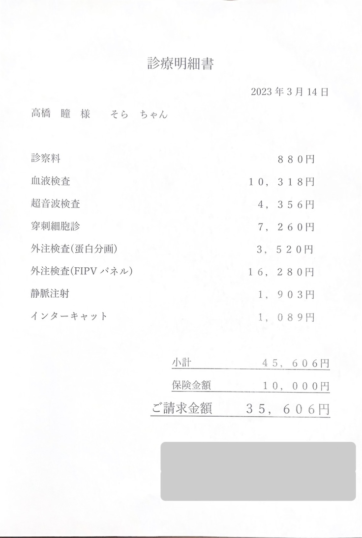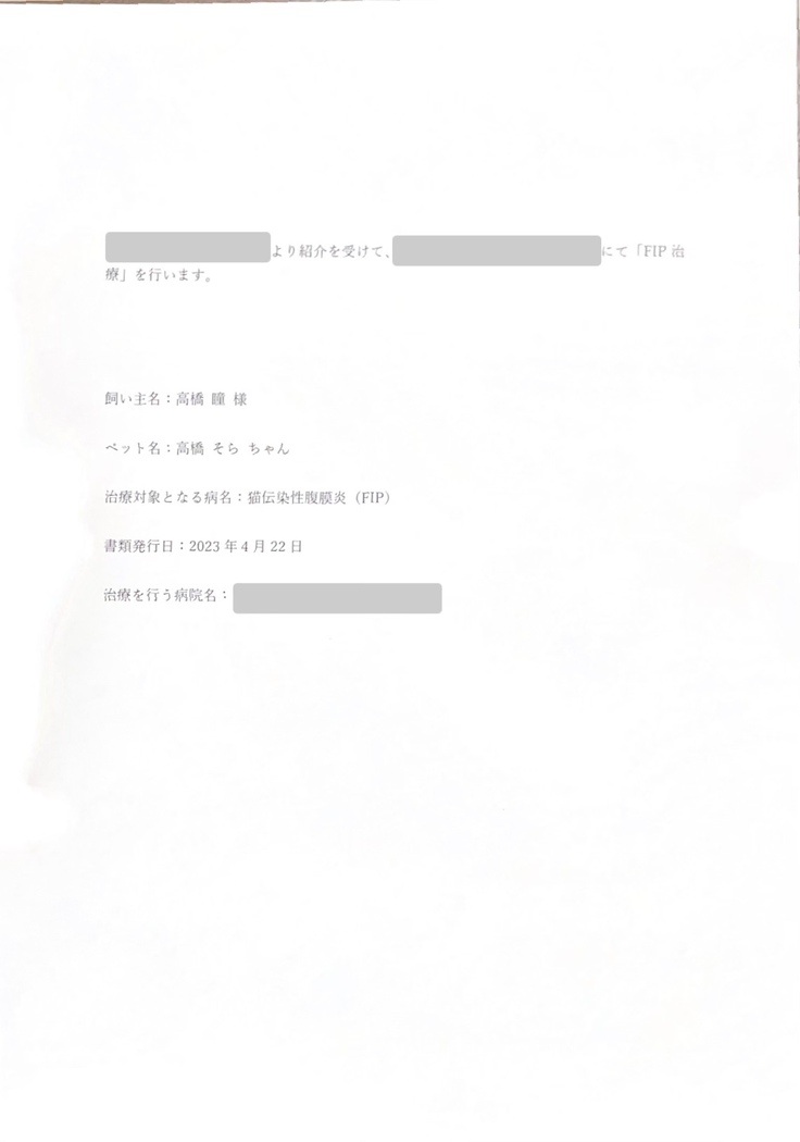 2023.3.17 紹介いただいた病院へ診察を受けにいきました。FIPを寛解出来る可能性がある治療があること、非常に高額な治療費になることを聞きました。