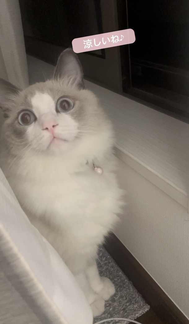 少し蒸し暑かったのでリビングの窓開けていたら、カーテンの中に入り込み、夜風に当たっておりました😊🌌
