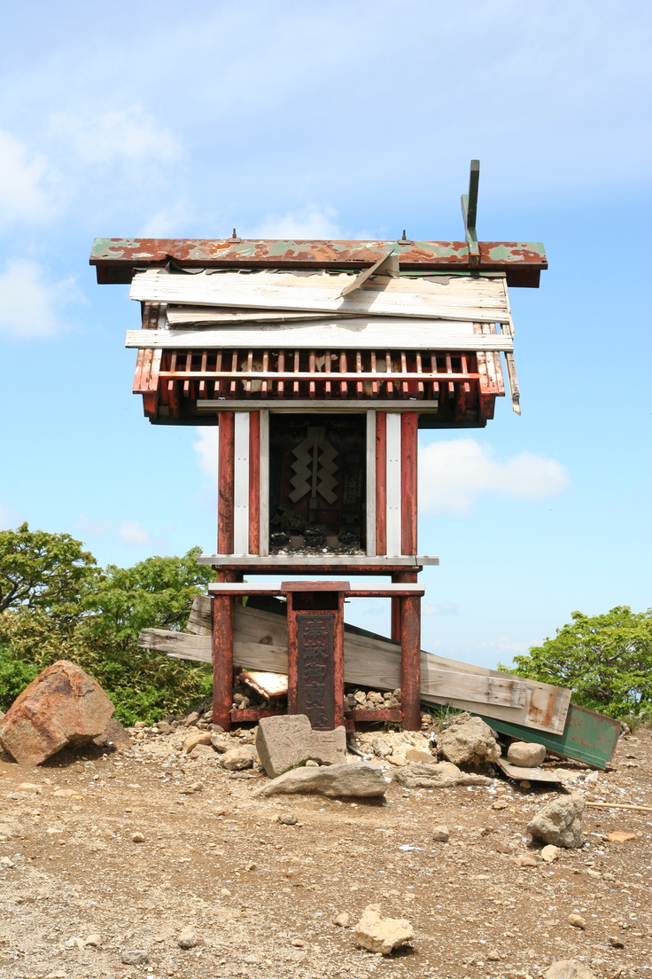 頂上の御社は鉄製のもので、かなりの重量があることから当時ヘリコプターで運搬して設置しました。設置以来35年、幾度かの修理を施しながら持ち堪えてきた御社も、風雪と火山性のガスの影響でかなり腐食と破損個所が目立つようになり、昨年冬には屋根が大きく壊れてしまいました。