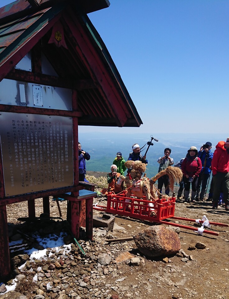 山開き終了後、頂上に登り、11時30分頃山頂祭が行われます。(雨天、強風の場合は中止 山開きの時期は登山コースにまだ残雪があり、積雪の状況や天候により山頂祭の実施時刻が前後します。)
