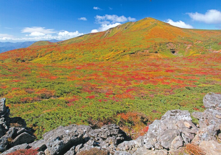 栗駒山の山頂へは、宮城・岩手・秋田の三方向から登ることができ、特に宮城県側の中央コースは徒歩約1時間30分で頂上に達します。なだらかな斜面が続き、頂上近くで若干の急斜面はあるものの、初めて登山をする方々にも程良い距離で眺望も楽しめる登山コースとなっています。山頂に立つと宮城・岩手の平野部はもとより、秋田・山形の山々を見渡すことができます。