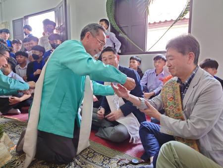 画像は前回の「托鉢」と並んで伝統的な仏教儀式である「バーシー」健康や繁栄、あるいは結婚・新築のお祝い時に行われる。これは、事務局が2月にラオスを訪れた際、無事の帰国を祈って祭主他学生たち全員から沢山の糸をまいていただいた。ネクストゴールに必ず到達できますように…