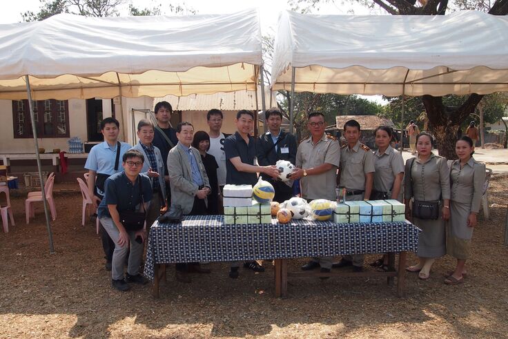 CSAが定期的に実施ている「ラオス視察 / ワーキング・スタディ・ツアー」今年2月に訪れた新校舎建設中のビエンチャン県 ナラオ村小学校で、校長先生にサッカーボールや教科書・ノートなどを手渡す。CSAの教育支援事業のひとつである。