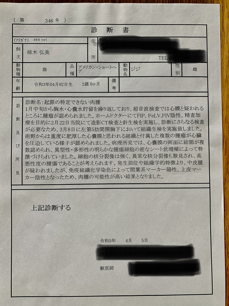精密検査の結果FIPではない事が判明しましたが、心臓の周りに大きな腫瘍が3つあり心臓を圧迫している事がわかりました。