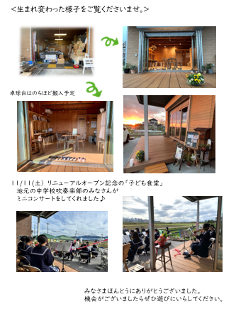 先日はクラウドファンディングに際しまして、温かいご支援を賜わり、まことにありがとうございました。 おかげさまで、このたび無事にリニューアル工事を完了することができ、今月の子ども食堂にて、地元の中学校吹奏楽部のミニコンサートとともにリニューアルオープンさせていただくことができました。