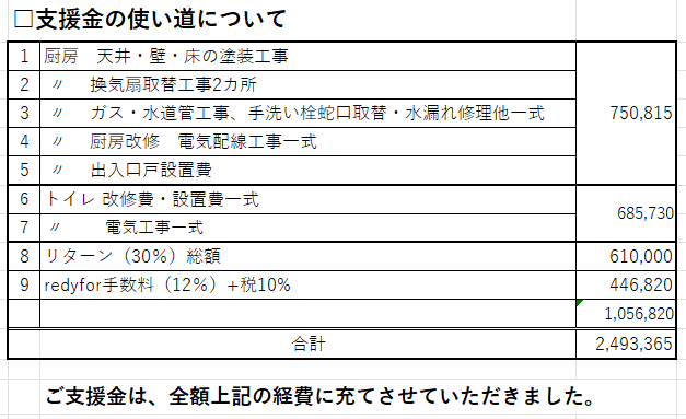 クラウドファンディング開始早々より、多くの皆様に応援していただき感謝申し上げます。クラウドファンディング開始が5月8日、その3日前の5月5日より厨房の改修工事に着手し同時進行で進めまてまいりました。結果、クラウドファンディング最終と同時に厨房に続きトイレの改修工事が完了いたしました。