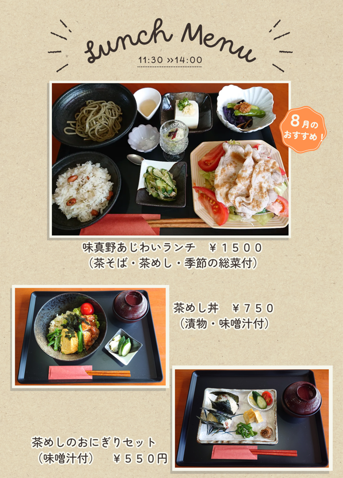8月のメニューはこちら!その初日、ご注文をいただいた茶めし丼に仕上げの小葱と刻みのりをのせずにお出ししてしまうという失敗をしてしまいました。