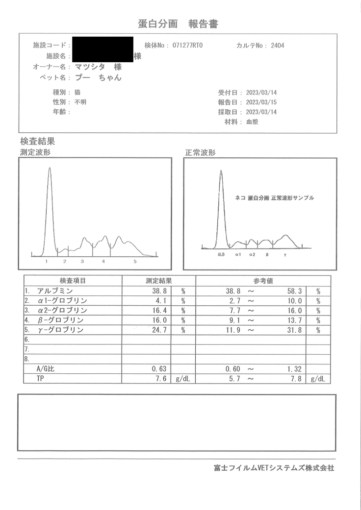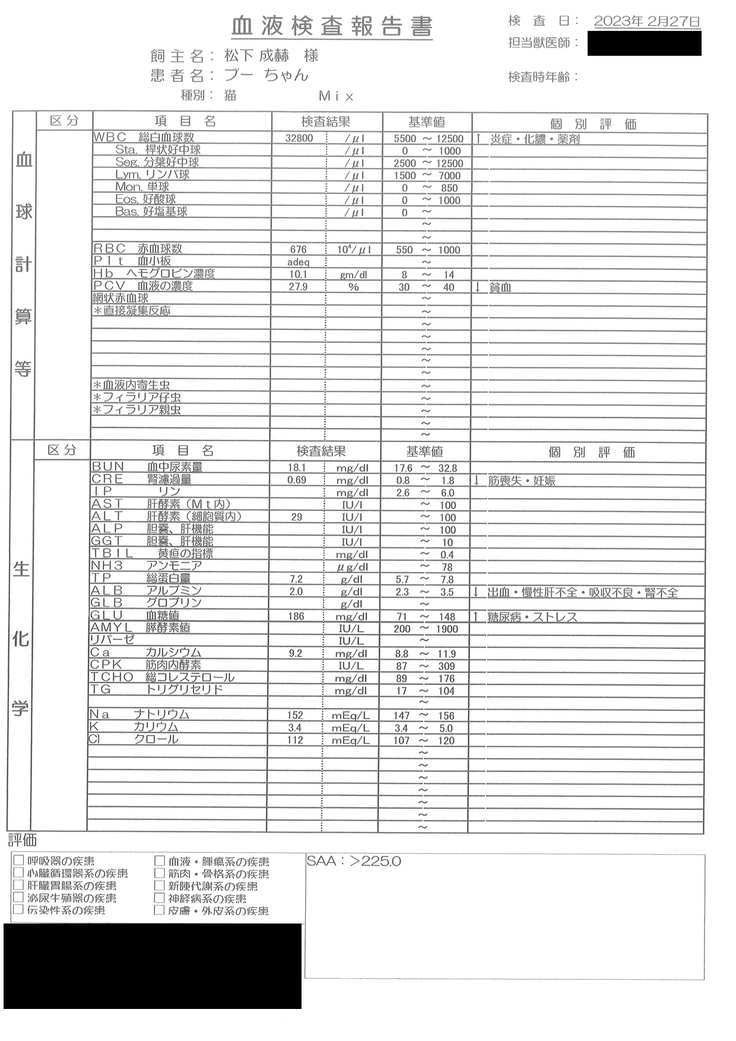 夕方、病院に伺うと、抜いた胸水の感じ(色や粘度)と、血液検査の結果炎症が強いことから、FIPの疑いがあり、高齢猫のFIP発症は珍しいけれど、念のため胸水をFIPのPCR検査に出すことになりました。結果は外注検査のため一週間ほどかかることに。