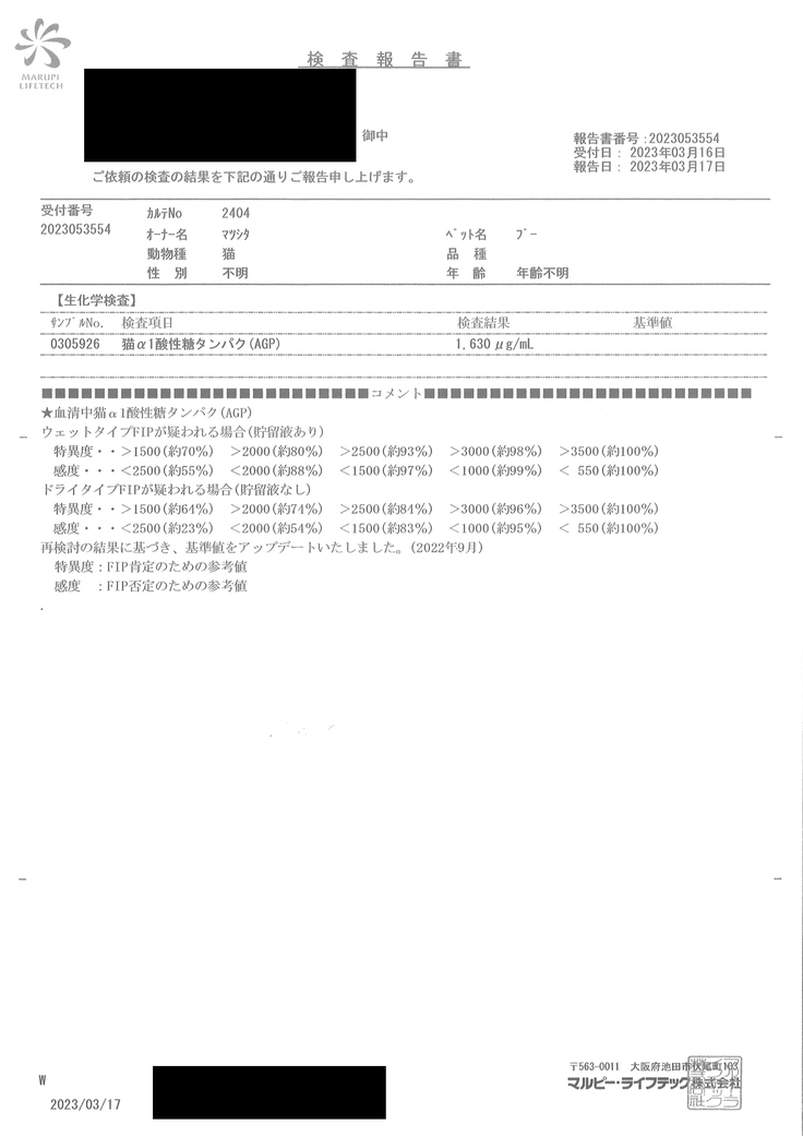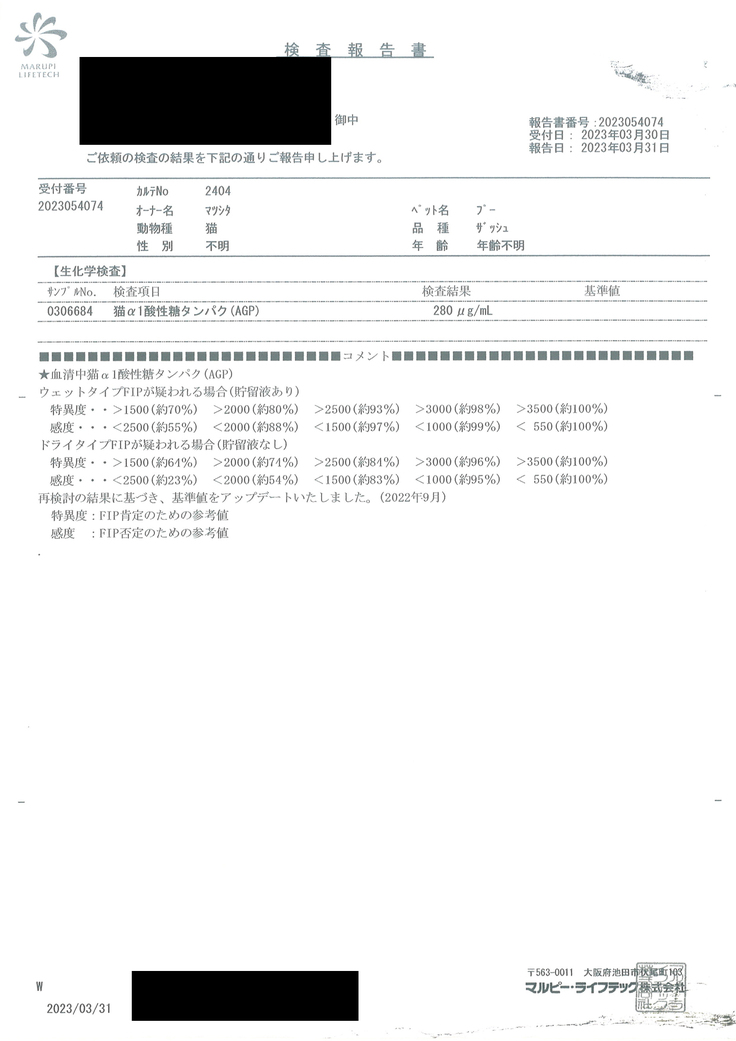 別途、FIP関連の検査費用が1回あたりおおよそ1万円/2週間、かかる予定です。