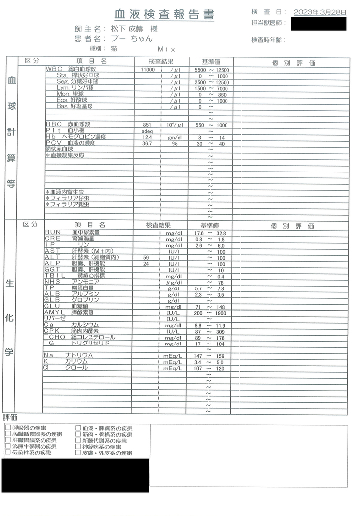 3月14日 投薬13日目 4.95kg 採血検査通院。胸水確認できず、体重減は胸水が止まった結果