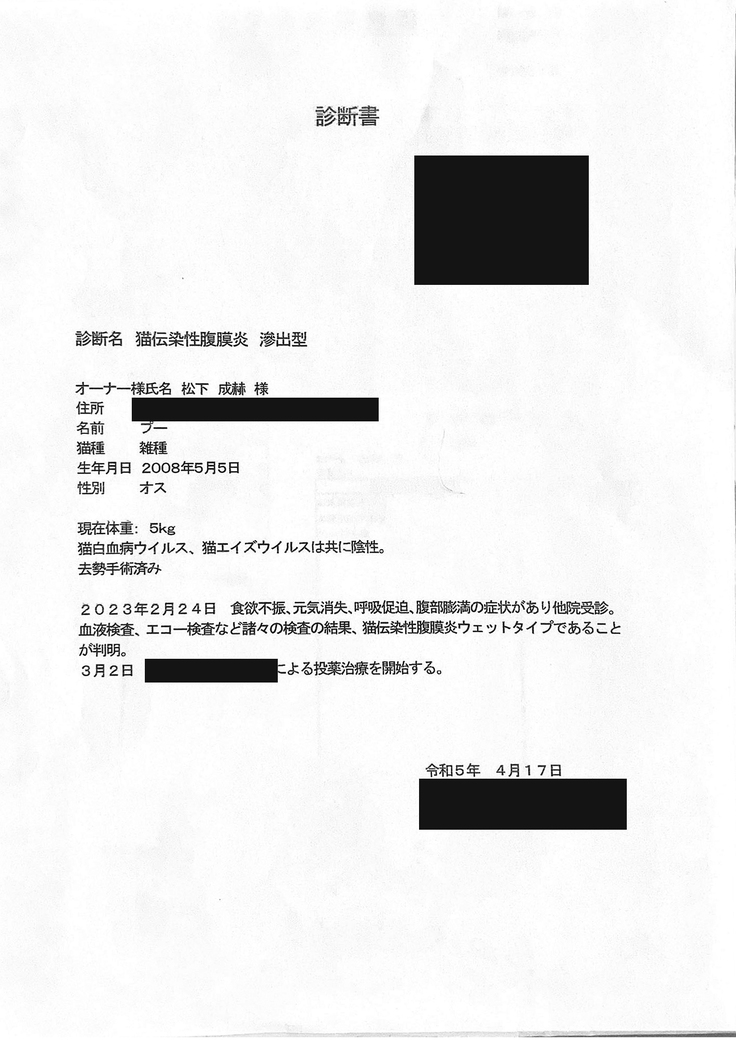 プーちゃんのFIP(猫伝染性腹膜炎)の治療にご支援をお願いします!