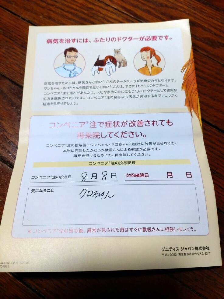 コンベニア(2週間効果のある抗生剤)を接種💉