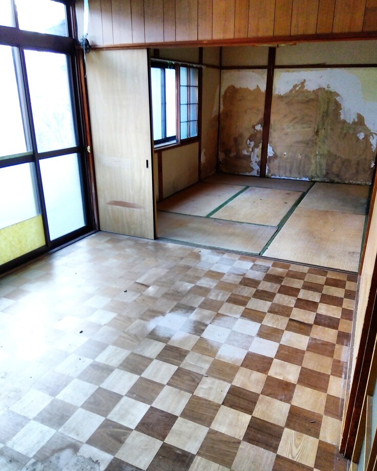 ところが、隣の建物は6年空家の為、壁紙は剥がれ、畳もカビている所があるためかなりの修繕工事が必要になります。