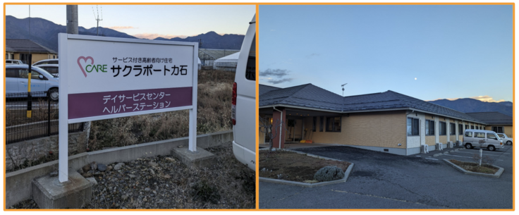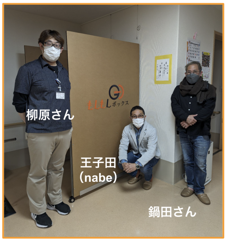 デイケアのスペースの一角に設置させていただきました。お世話になったサクラサポート力石の柳原さんと日本医療福祉デザイン協会の鍋田さんと一緒に記念写真。コロナ禍のピークは過ぎているとはいえ、マスクは必須です。