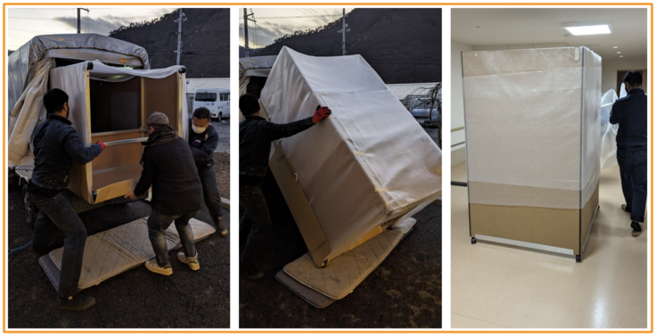 陽が沈みかけた17時に搬入が始まりました。組み上げたボックスを赤帽さんに運んでもらいました。