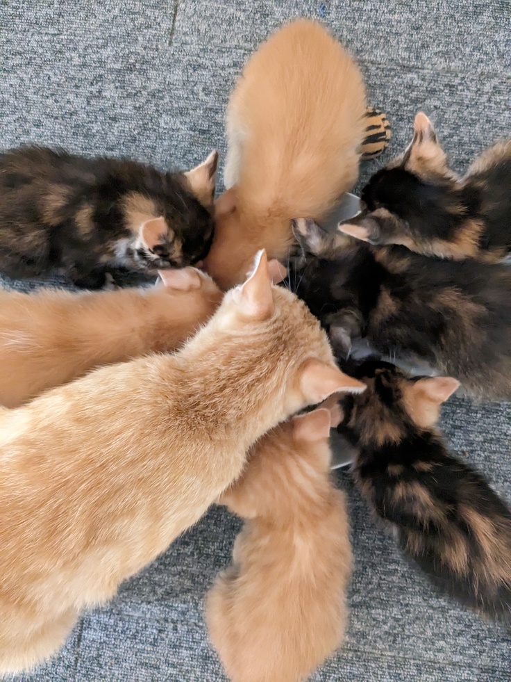 ちゃび母ちゃんにも負けないぐらい食意地をはるようになった子猫達。7匹兄妹は本当に大変だ💦