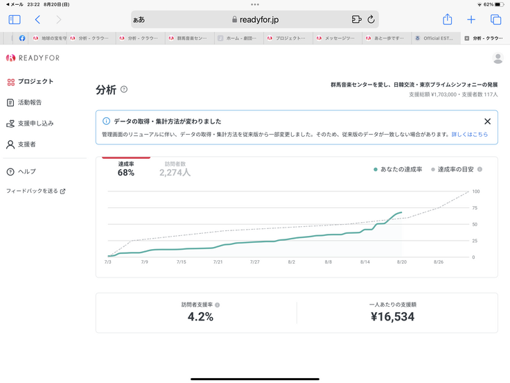 あと一歩のところまで来ました。現在8月20日、23時45分現在、サイト訪問者数、2274人、訪問者支援率4.2%です。支援者は、117人、支援総額は1,703,000円にまで届きました。