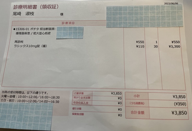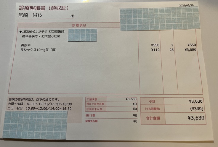前回お薬をもらってから、たまに呼吸が速いときなどに薬を追加して、7日間の間に薬を全部で7錠追加して飲ませましたが、食欲もあり体重も落ちていないので血液検査をしなくても大丈夫ということで、また2週間分のお薬をもらってきました。