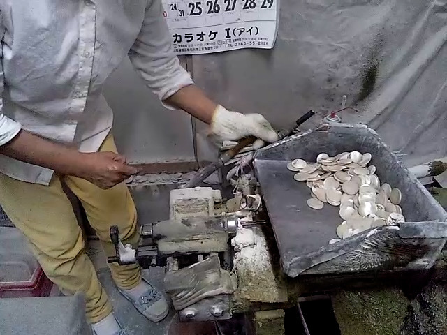 挽き場・・・通常表面のみ型を付けるところ、SB01xxは裏面を丸く型形成するのでこの作業を手間を掛けて2回行うことになります。またこの工程はオーダーシャツ用の貝釦として提案されてきた裏丸という高級仕様でボタンを外すときの滑らかさが格段に上がります。