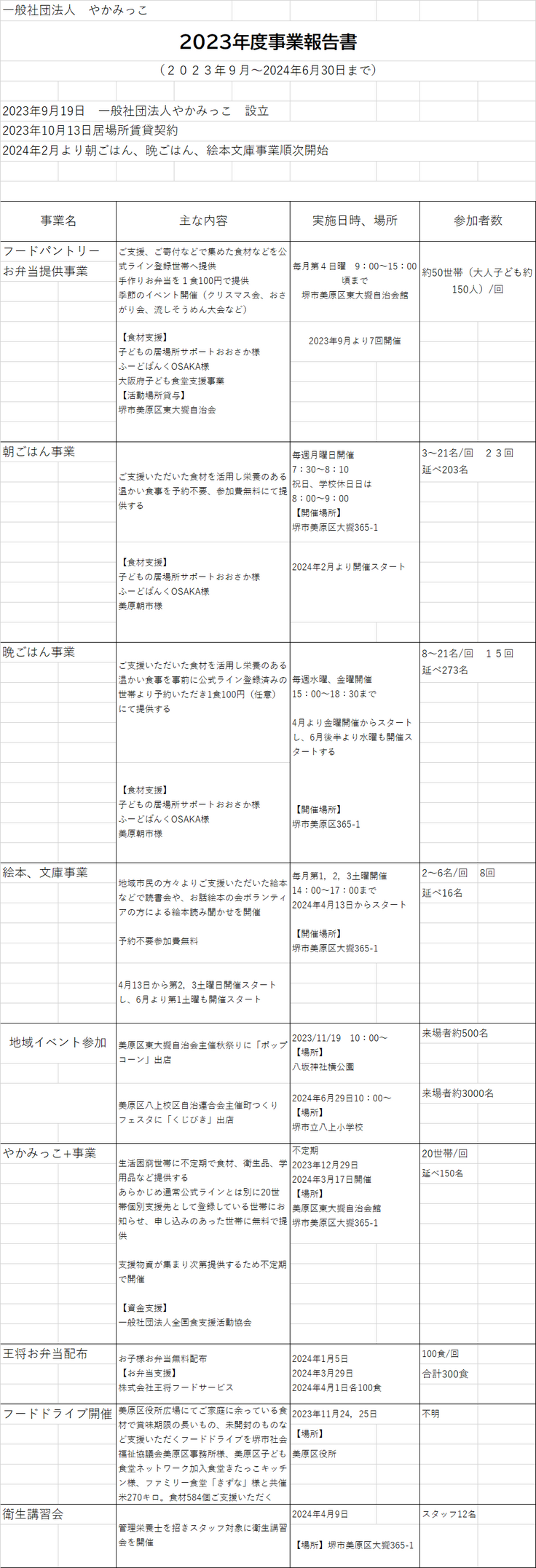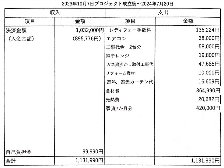 残りの支援金はお家賃、食材費、高熱費など運営費に利用しました。