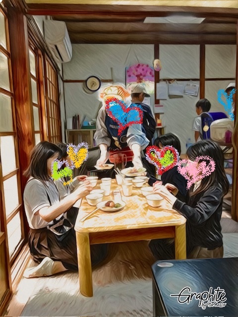 この中の朝ごはん、晩ごはん、絵本文庫事業の運営に支援金を利用させていただきました