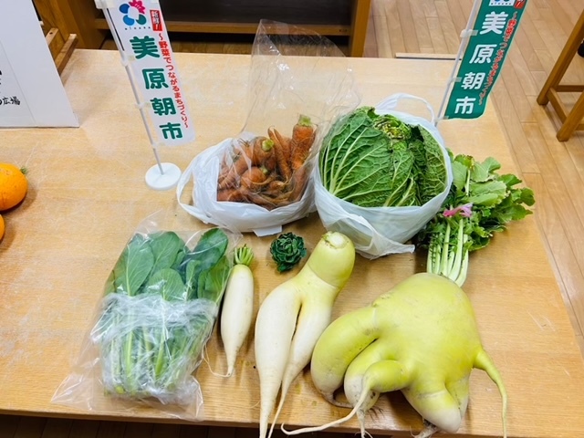 毎週土曜に美原朝市様の新鮮野菜のご支援もいただき