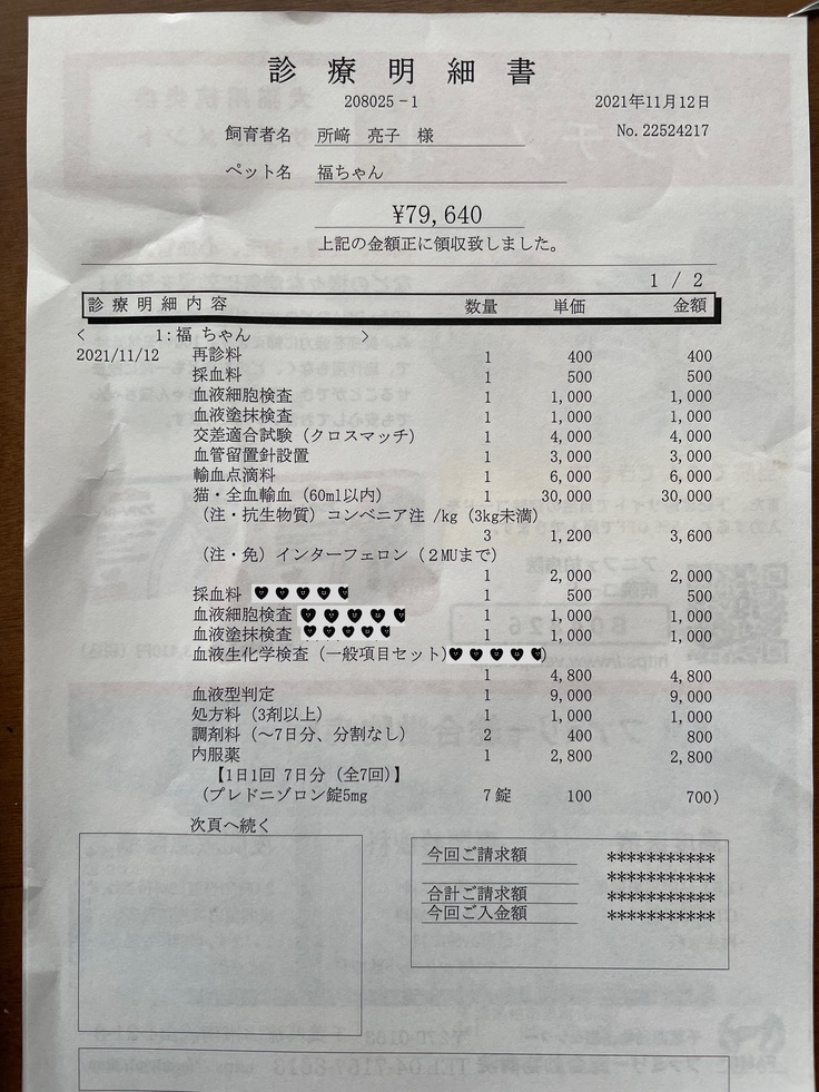 病院に連絡すると、「輸血ドナーの猫ちゃんを連れてきてほしい」と言われ、すぐに猫を飼っている方に連絡し、ドナーの承諾をいただき、福と輸血ドナー猫ちゃんを連れて病院に行くことになりました。
