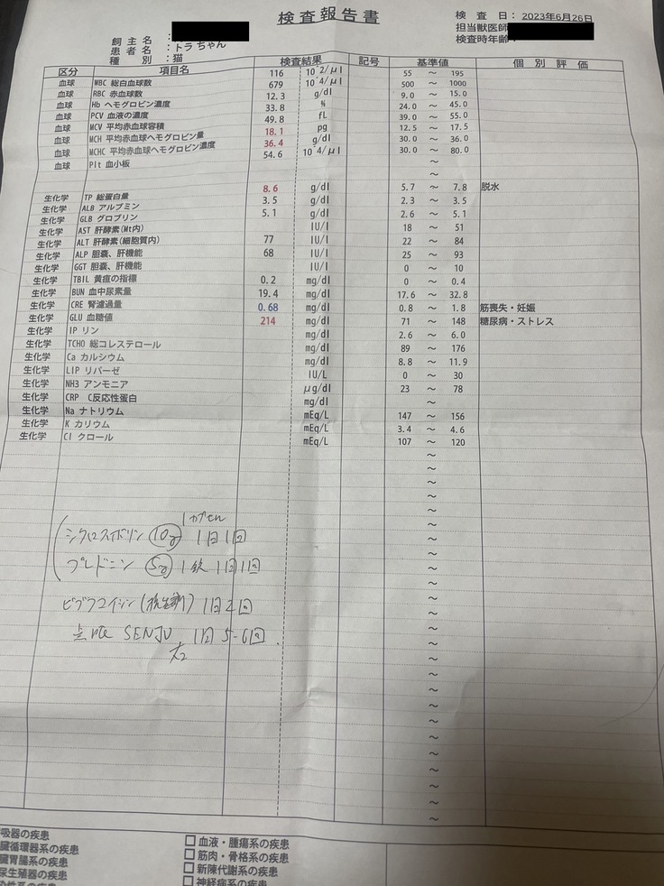 本日、2週間ぶりの病院に行って来ました。投薬量を少なくして2週間、薬の影響を確認する為の血液検査を行いました。結果は良好です。体重も5.86kgになり、2週間前よりも0.22kg増加しました。下痢も治まり、日に日に元気になってます。朝起きるとトラちゃん含め、三匹の猫たちがチューるのおねだりで並んでいます。
