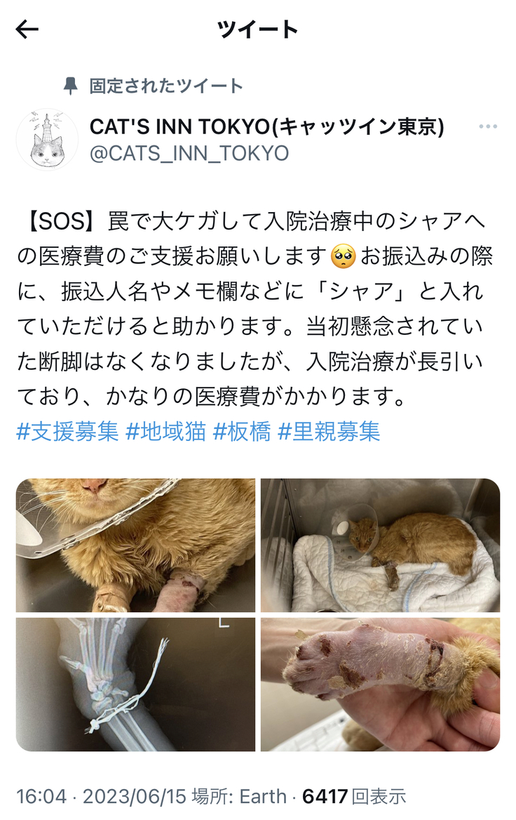 傷病猫ちゃんの治療に日々奮闘されているCAT'S INN TOKYOの事を知っていただけると幸いです。
