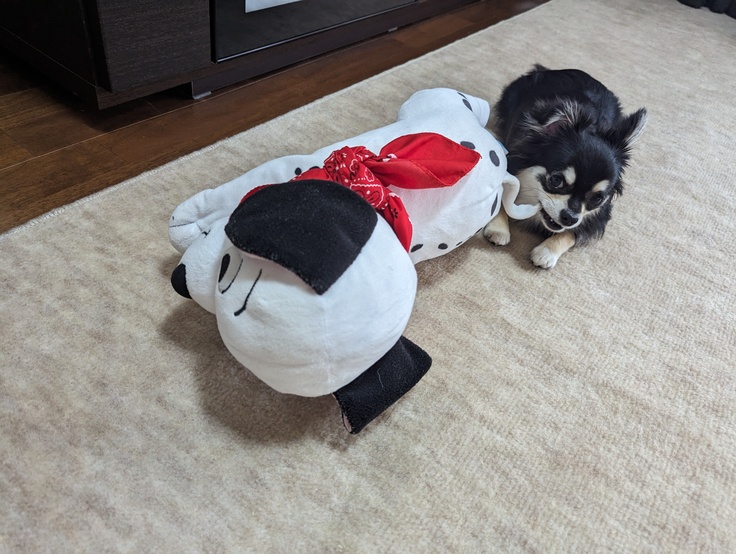 ぴのは101匹わんちゃんのぬいぐるみのしっぽをカミカミするのが大好きです♡