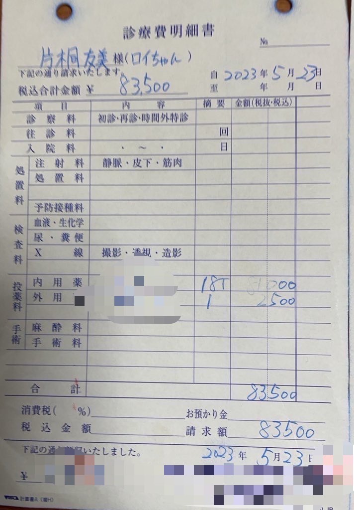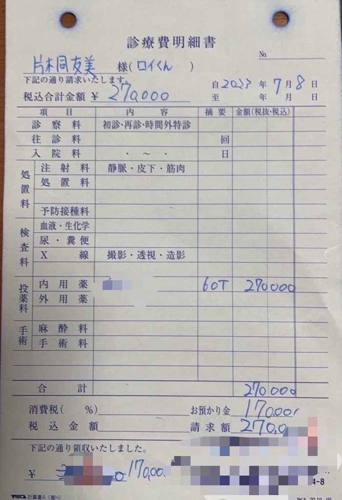 毎日の経過観察、【写真】、治療費の領収書等のご報告をさせていただきます。