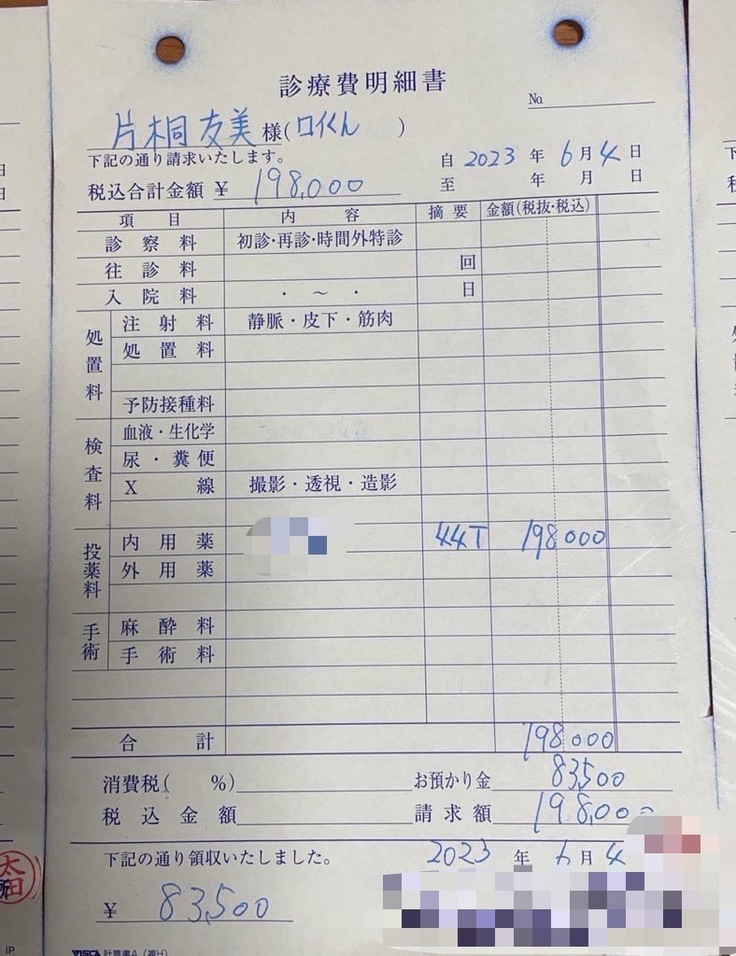 【¥604,112-】で【¥551,500−(お薬代金のみの値段)】今まで支払いを待って頂いていた分を全て一括で払わせていただきました。
