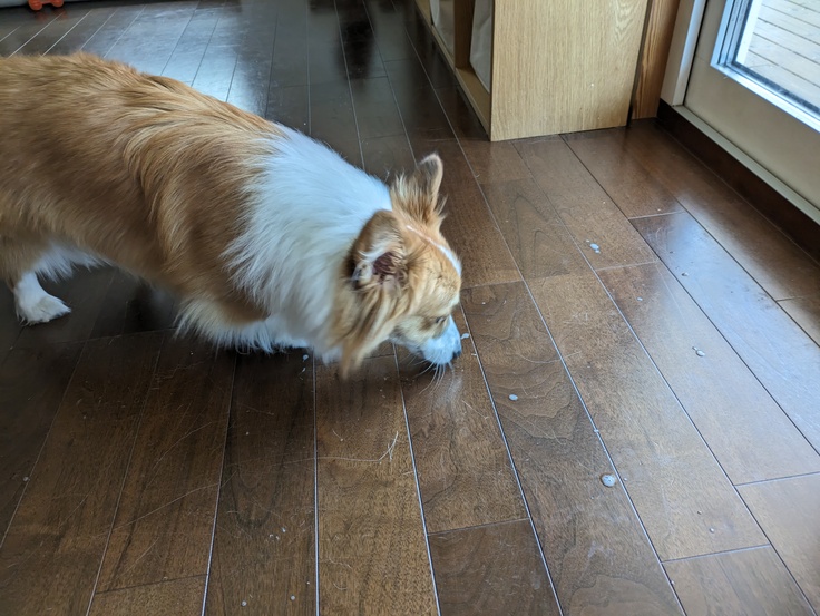むせて汚してしまった床をセルフお掃除中のメイちゃん✨お掃除はありがたいけど綺麗なお水を飲んでいいんだよ💦