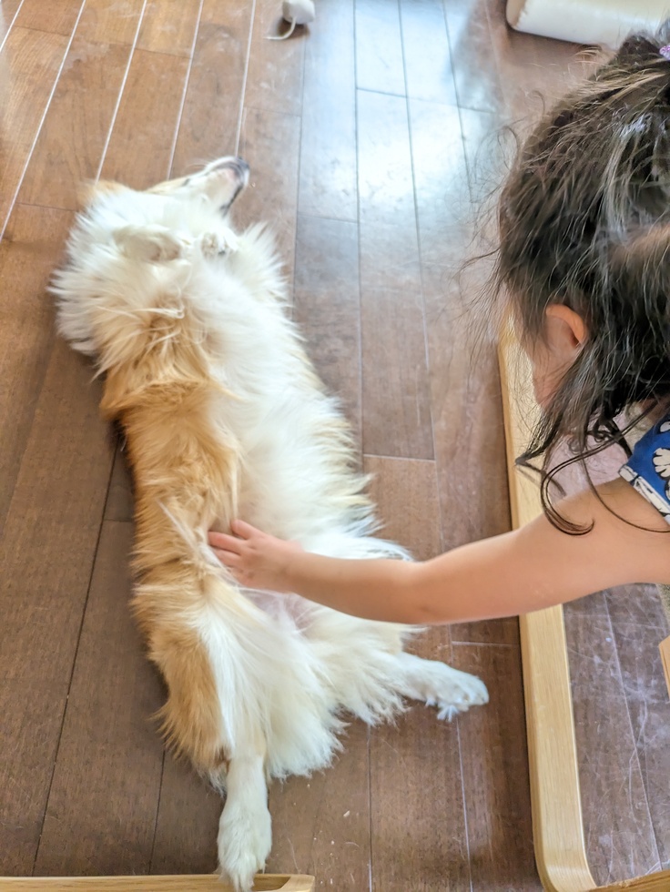 メイちゃんにとって娘は先住犬フレブルと同じ存在🐶甘噛みして時々泣かせてしまいますがベストフレンド😊娘もむせさせずにメイちゃんにご飯をあげることができます👍