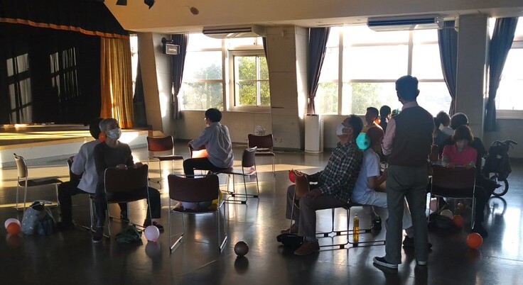 二つの椅子を向かい合わせて配置し、そこに二人が背中を合わせて座り、相手の背中に向けてお互い押し合いするという動作を行いました。まるで押しら饅頭のようでした。また、お互いの首の後ろに風船を入れて首の部分を緩く押し合う動作も追加されました。