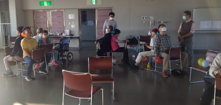起立が困難である参加者は椅子に座った状態で手足を動かし自身を表現されてました。真似をする方は相手が次に行う動作を即座に判断し、次に自身の動作をプログラミングし、実行に移さないといけない為、注意力や集中力が要求され大変なようでした。勿論、完璧を求めてませんので間違いは問題ありません。四肢の運動に加えて認知面での訓練にもなったようでした。