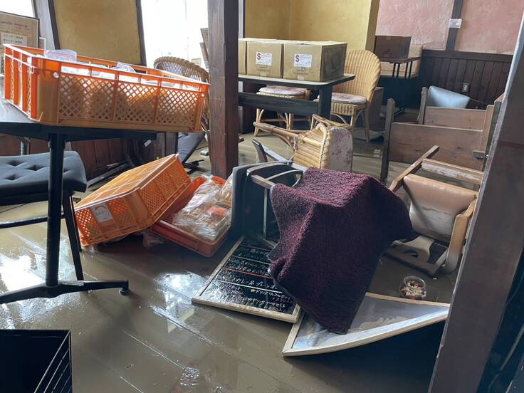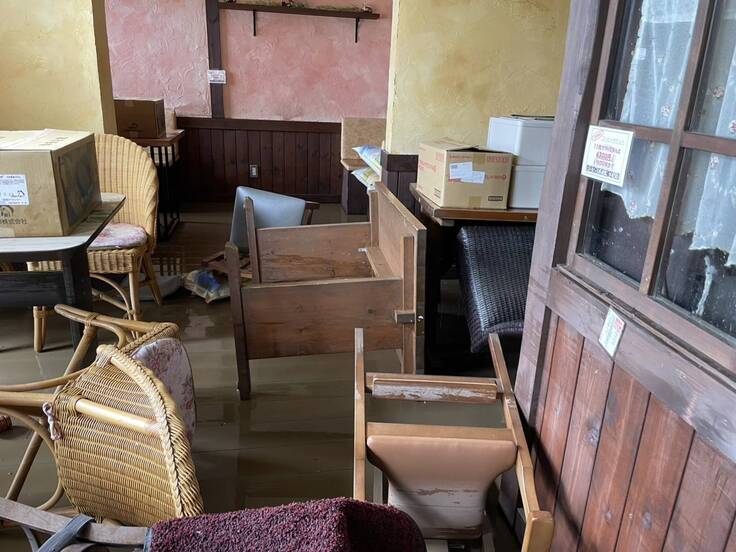 食品・食器はもちろんのこと、床下1m以上浸水してしまったのでエアコンや冷蔵庫・厨房器具・イス・机等お店の中の物のほとんどが廃棄となってしまうほどの状況で、被災直後はお店を再開することも不可能かと思いました。